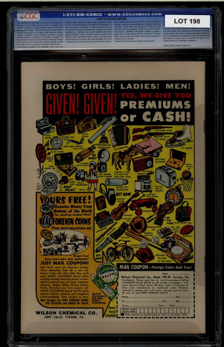 The Auctioneer has reserved the right to reject any and all bids, and to bid at the auction. Auctioneers Auctions are not on approval. Auctioneer does not allow certified material to be returned because of possible differences of opinion with respect to the grade offered by any third party organization, dealer, or service. Absolutely no guarantee of grade is offered for un-certified property sold and subsequently submitted to a third-party grading service. There will be no exceptions to this policy. Under extremely limited circumstances, (e.g. gross cataloging error) a purchaser, who did not bid from the floor, may request Auctioneer to evaluate voiding a sale; such request must be made in writing detailing the alleged gross error, and submission of the lot to the Auctioneer must be pre-approved by the Auctioneer. Bidder must notify Auctioneer in writing of such request within three (3) days of the non-floor bidder receipt of the lot. Any lot that is to be evaluated must be in our offices within 30 days after Auction. Grading does not qualify for this evaluation process nor do such complaints constitute a basis to challenge the authenticity of a lot. AFTER THAT 30-DAY PERIOD, NO LOTS MAY BE RETURNED FOR REASONS OTHER THAN AUTHENTICITY. Lots returned must be housed intact in the original holder. No lots purchased by floor Bidders may be returned (including those Bidders acting as agents for others). Late remittance for purchases may be considered just cause to revoke all return privileges. B: Auctions conducted solely on the Internet have a THREE (3) DAY RETURN POLICY: Lots paid for within seven days of the Auction closing are sold with a three (3) day return privilege. You may return lots under the following conditions: Within three days of receipt of the lot, you must first notify Auctioneer by contacting Client Service by phone (314-680-8599) or e-mail (moundcityauctions@gmail.com), and immediately mail the lot(s) fully insured to the attention of Returns, Mound City Auctions 1081 Teson Rd. Hazelwood, MO. 63042. Lots must be housed intact in their original holder and in their original condition. You are responsible for the insured, safe delivery of any lots. Auctioneer will not be responsible for lots returned in non-registered mail or lots returned without prior authorization per section B. A non-negotiable return fee of 5% of the purchase price ($10 per lot minimum) will be deducted from the refund for each returned lot or billed directly. Postage and handling fees are not refunded. After the three-day period (from receipt), no items may be returned for any reason. Late remittance for purchases revokes all Return-Restock privileges. C: Bidders who have inspected the lots prior to the auction will not be granted any return privileges. D: Comic books sold referencing a third-party grading service are sold “as is” without any express or implied warranty. Certain warranties may be available from the grading services and the Bidder is referred to them for further details: Certified Guaranty Company, LLC. (CGC), P.O. Box 4738, Sarasota, FL 34230. E: Bidders who intend to challenge authenticity or provenance of a lot must notify Auctioneer in writing within thirty (30) days of the Auctions conclusion. In the event Auctioneer cannot deliver the lot or subsequently it is established that the lot lacks title, provenance, authenticity, or other transfer or condition issue is claimed, Auctioneer's liability shall be limited to rescission of sale and refund of purchase price; in no case shall Auctioneer's maximum liability exceed the high bid on that lot, which bid shall be deemed for all purposes the value of the lot. After one year has elapsed, Auctioneer's maximum liability shall be limited to any commissions and fees Auctioneer earned on that lot. F: All comics are guaranteed genuine, but are not guaranteed as to grade, since grading is a matter of opinion, an art and not a science, and therefore the opinion rendered by the Auctioneer or any third party grading service may not agree with the opinion of others (including trained experts), and the same expert may not grade the same item with the same grade at two different times. G: Since we cannot examine encapsulated comics, they are sold “as is”without our grading opinion, and may not be returned for any reason. Auctioneer shall not be liable for any patent or latent defect or controversy pertaining to or arising from any encapsulated collectible. In any such instance, purchaser's remedy, if any, shall be solely against the service certifying the collectible. H: Due to changing grading standards over time, differing interpretations, and to possible mishandling of items by subsequent owners, Auctioneer reserves the right to grade items differently than shown on certificates from any grading service that accompany the items. Auctioneer also reserves the right to grade items differently than the grades shown in the prior catalog should such items be reconsigned to any future auction. I: Although consensus grading is employed by most grading services, it should be noted as aforesaid that grading is not an exact science. In fact, it is entirely possible that if a lot is broken out of a plastic holder and resubmitted to another grading service or even to the same service, the lot could come back with a different grade assigned. J: Certification does not guarantee protection against the normal risks associated with potentially volatile markets. The degree of liquidity for certified collectibles will vary according to general market conditions and the particular lot involved. For some lots there may be no active market at all at certain points in time."