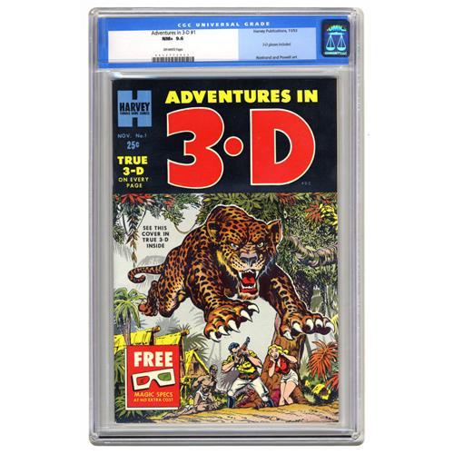 <B>Adventures in 3-D #1 (Harvey, 1953) CGC NM+ 9.6 Off-white pages.</B></I> Here's a specimen from the brief period when 3-D comics were all the rage. Howard Nostrand and Bob Powell contributed art to this issue. This is the first time we've seen a copy in such pristine condition! CGC notes, "3-D glasses included." Overstreet 2006 NM- 9.2 value = $200. CGC census 4/06: 2 in 9.6, none higher.