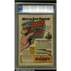 Adventures of Alan Ladd #1 (DC, 1949) CGC VF- 7.5 Cream to off-white pages. The first issue bearing this Hollywood leading man of the day features a photo cover that wouldn't be "correct" today. Our hero is demonstrating his prowess at rolling his own! Still, there were no "no smoking" warnings 50 years ago, so Alan can be forgiven. This is a very nice copy and a bit of a departure for DC in the 1940s, with Dan Barry, Carmine Infantino, Ruben Moreira, and Jack Sparling all contributing interior art. This ranks as the finest copy CGC has graded to date. Overstreet 2002 VF 8.0 value = $597. Important notice: We expect to be auctioning lots at the rate of 200-250 per hour. Sometimes eBay Premier live bid software cannot keep up with that pace, so we strongly recommend that you place a realistic proxy bid now as insurance to avoid disappointment. Also please note that all Heritage/CAA lots purchased through eBay Premier carry a 20% Buyer's Premium.