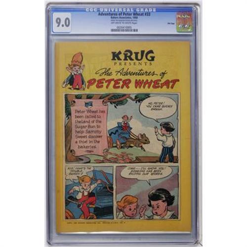<B>Adventures of Peter Wheat #33 File Copy (Bakers Associates, 1950) CGC VF/NM 9.0 Off-white to white pages.</B></I> Bakers Associates Giveaway. Walt Kelly art. Sixteen pages in color. Paper cover. CGC notes, "From the Random House Archives." Overstreet 2007 VF/NM 9.0 value = $86; NM- 9.2 value = $110. CGC census 9/07: 2 in 9.0, 6 higher.<BR><BR><b>Shipping:</b> Comics - Slabbed (certified) (<a target="_blank" href="http://www.heritageauctions.com/common/shipping.php">view shipping information</a>)
