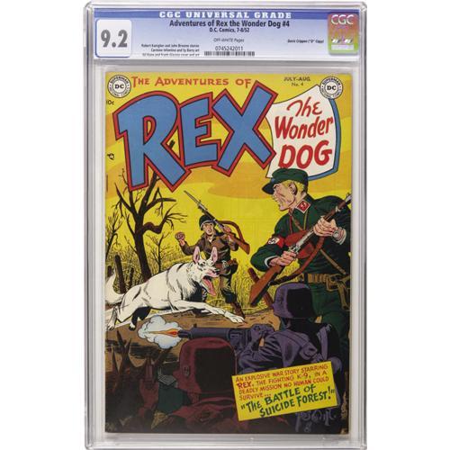 <B>Adventures of Rex the Wonder Dog #4 Davis Crippen ("D" Copy) pedigree (DC, 1952) CGC NM- 9.2 Off-white pages.</B></I> This is the only copy of this issue on CGC's census as of this writing. And the condition is sure to please -- note the fresh cover colors. The backup story features another mammal, Detective Chimp, drawn by Carmine Infantino. The cover art is by Gil Kane. Overstreet 2006 NM- 9.2 value = $460. CGC census 9/06: 1 in 9.2, none higher. <I>From the Crippen Collection</B></I>.<BR><BR><b>Shipping:</b> Slabbed Comic (<a target="_blank" href="http://www.heritageauctions.com/common/shipping.php">view shipping information</a>)
