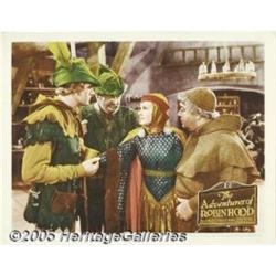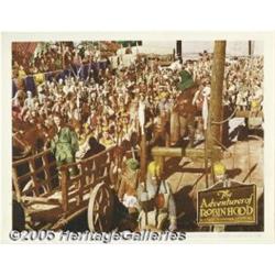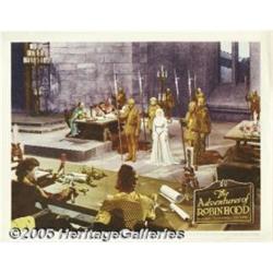 <B>Adventures of Robin Hood (Warner Brothers, R-1942)</B></I> Lobby Cards (3) (11" X 14"). Offered in this lot are three scene cards from this set. The first card features Robin (Errol Flynn) in a cart being led off to the gallows after the archery tour tournament. The second card shows Maid Marion (Olivia de Havilland) as she plots with the men of Sherwood to free Robin. The third card shows Marion standing before the court of execution, wrongfully accused of treason. The scene cards in this lot are from the 1942 reissue of the film. There are corner bumps, trivial border wrinkles and some light toning. Very Fine. 3 items