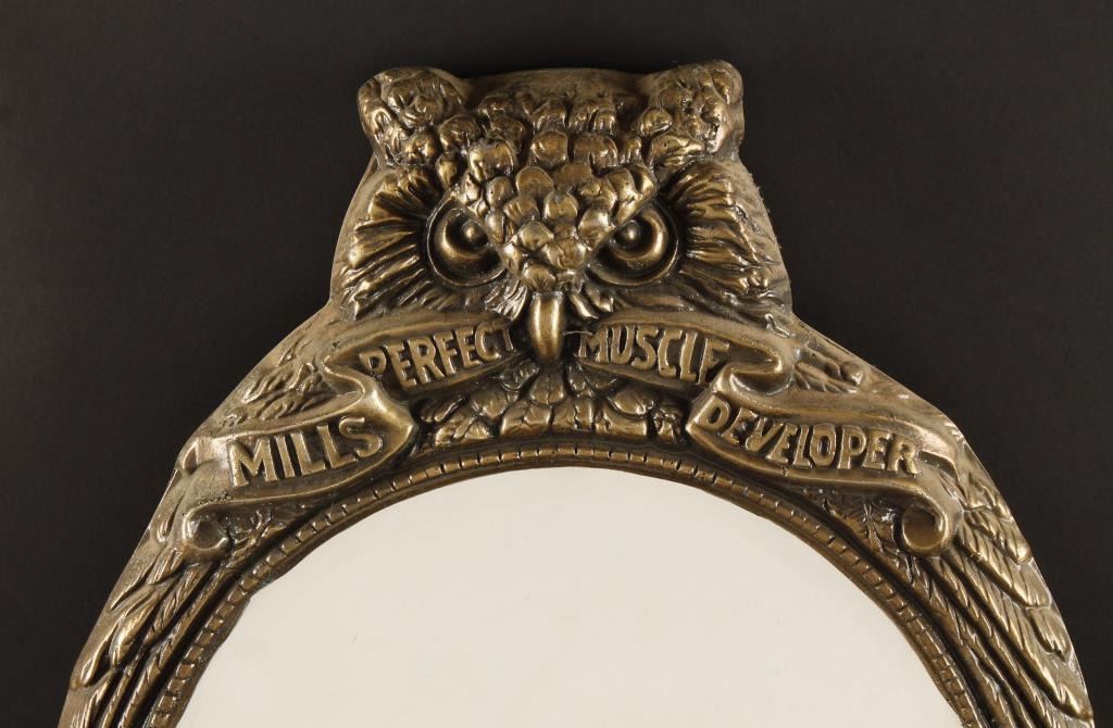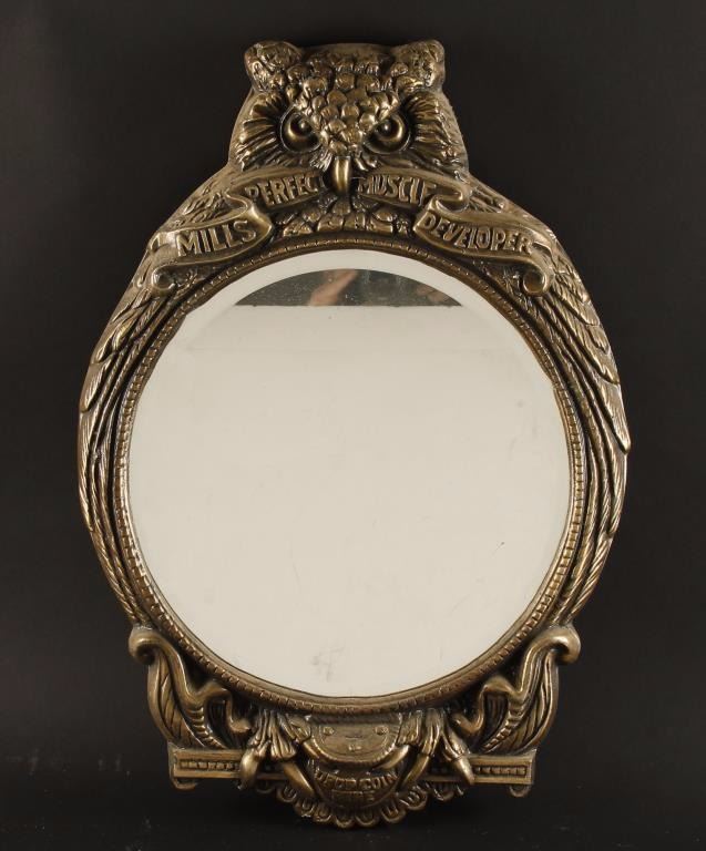 "Mills Perfect Muscle Developer", metal cast frame of an owl with a center beveled mirror. Measures 15 3/4"x23".