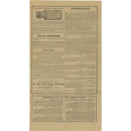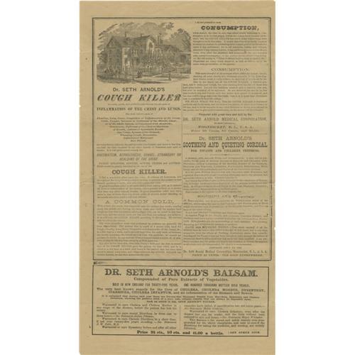 <B>Advertising Broadside for Dr. Seth Arnold's Medical Remedies</B></I> Dr. Seth Arnold Medical Corporation, Woonsocket, RI advertising sheet with numerous testimonials for Arnold's Cough Killer, Arnold's Soothing Cordial, and Arnold's Balsam. Interesting bottom panel in the form of ad note. Brown paper, 200 mm by 360 mm. Extremely Fine.<BR><BR><b>Shipping:</b> Flat Material, Small (<a target="_blank" href="http://www.heritageauctions.com/common/shipping.php">view shipping information</a>)