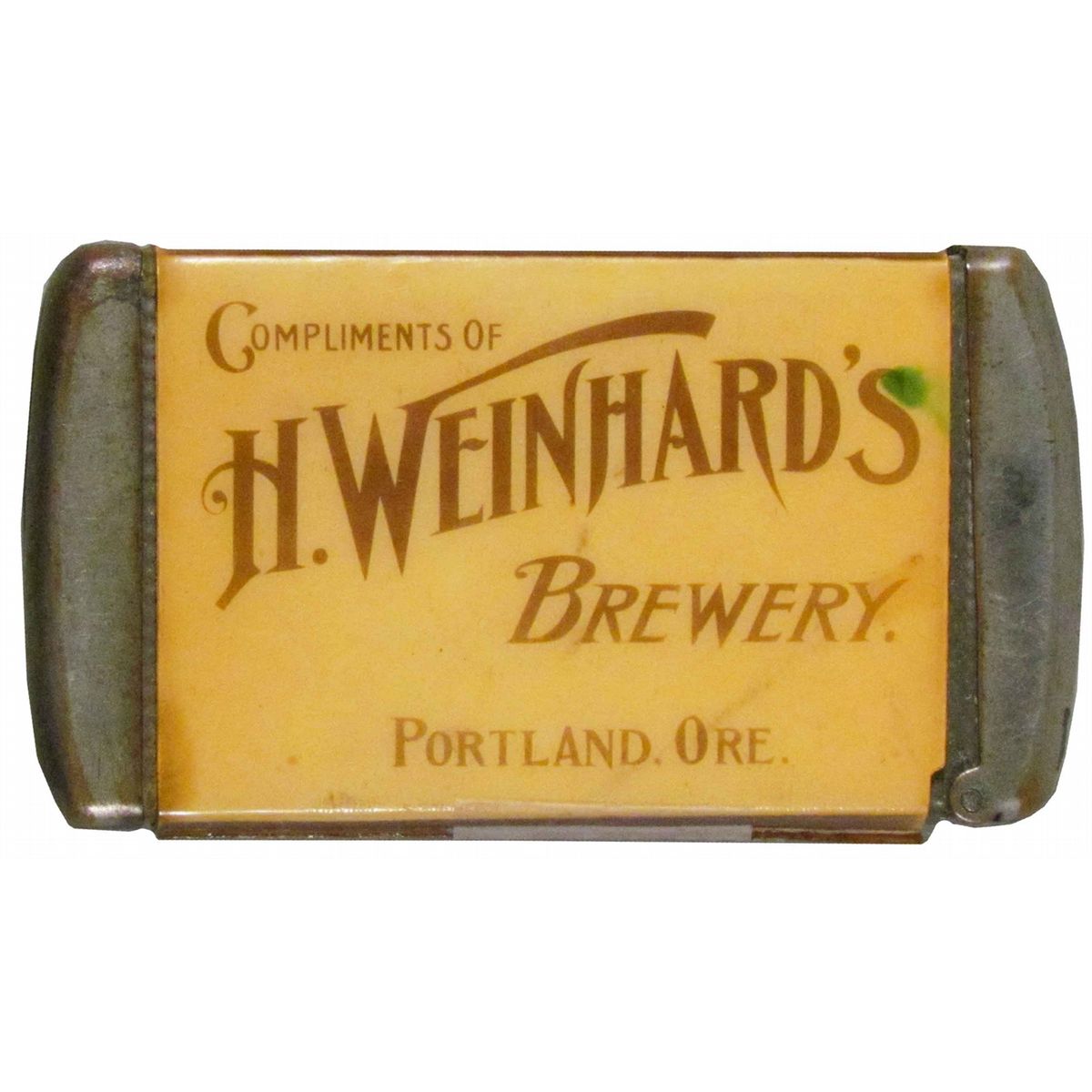 Advertising Celluloid Match Safe. Compliments of H. Weinhard's Brewery. Portland, Ore. Factory scene on front. Wear to nickel and age discoloration otherwise good condition. 1 1/2 X 2 5/8 inches.