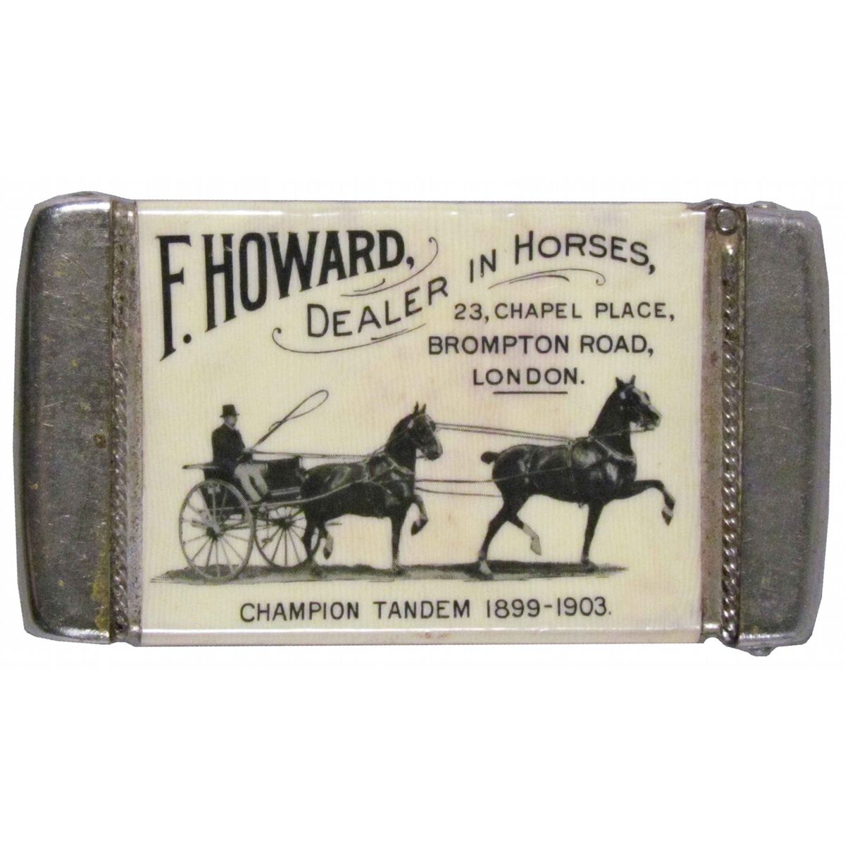 Advertising Celluloid Match Safe. F. Howard Dealer in Horses. Depicting Champion Tandem 1899-1903 on front and Jersey Lilley on back. Very good condition. 1 1/2 X 2 7/8 inches.