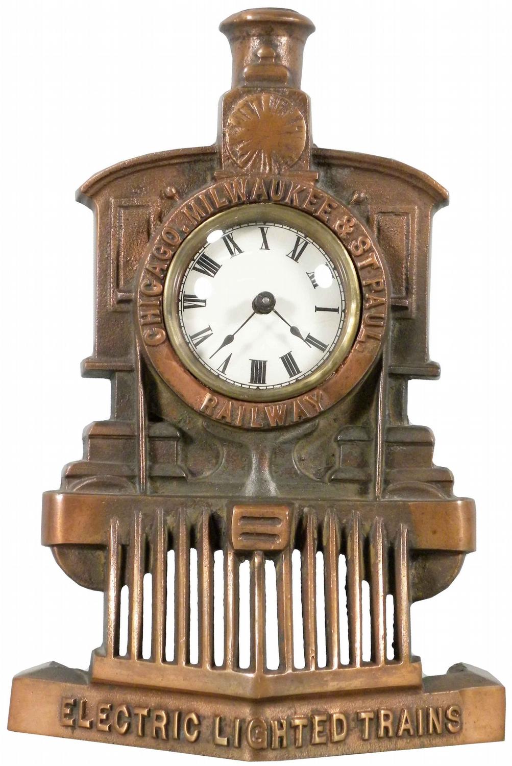 Advertising Clock for the Chicago, Milwaukee and St. Paul Railway. Electric Lighted Trains. Copper oxidized cast iron. Excellent condition. 7 1/2 X 10 3/4 X 4 inches.