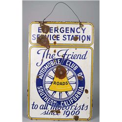 Double sided Auto Club Emergency Service Station Sign, With the Good Roads Bell and Spoked wheel logo, reads "The Friend of all motorists since...