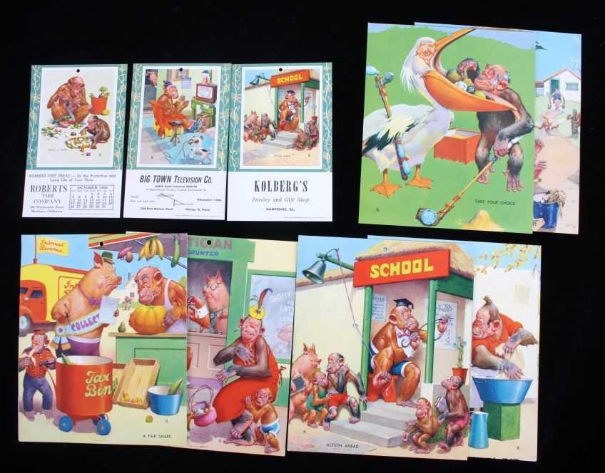 This lot features a direct mail advertising booklet from the publishing company, Brown & Bigelow, titled "Lawson Wood's Monkey Business" and dated 1958-59, as seen on the spiral booklet spine. Lawson Wood was a British painter, illustrator, and designer known for his comical depictions of animals, policeman, cavemen, and dinosaurs. His most famous character was Gran’pop, a ginger-haired ape. The popularity extended to merchandise, such as pottery, calendars, postcards, cigarette cards, and direct mail advertising. Peppin and Micklethwait, authors of the "Dictionary of British Book Illustrators, the Twentieth Century", cite Percy Bradshaw as saying Wood had a "breadth, ease and fluency which many an infinitely more serious artist must envy". Included are vintage "Topics of the Tropics" advertising direct mail pamphlets featuring illustrations of cartoon animals, including the famous Gran'pop. The front displays a full color cartoon and inside is an illustrated “Topics of the Tropics” newsletter full of humorous local "news". This is in great vintage condition and measures 7" L x 6" W when folded. Six have varied companies' advertising and six are sample advertising blanks. Also included are twelve advertising legal size blotters featuring the cartoons, with six having varied companies advertising and six are sample advertising blanks. These measure 9" H x 4" W. Also included are three companies' envelope size blotters that measure 6.25" L x 3.25" W. Three advertising postcards that measure 5.5" H x 3.5" W are also included. Lastly are two sample "Easy-To-Use Direct Mail Copy" letters, one "Plated Ad Copy" pamphlet, two unused Brown & Bigelow return envelopes, and one advertising "how to" pamphlet. All items are in near mint condition. The booklet overall measurements 10.5" H x 7" W x .75" D approximately.