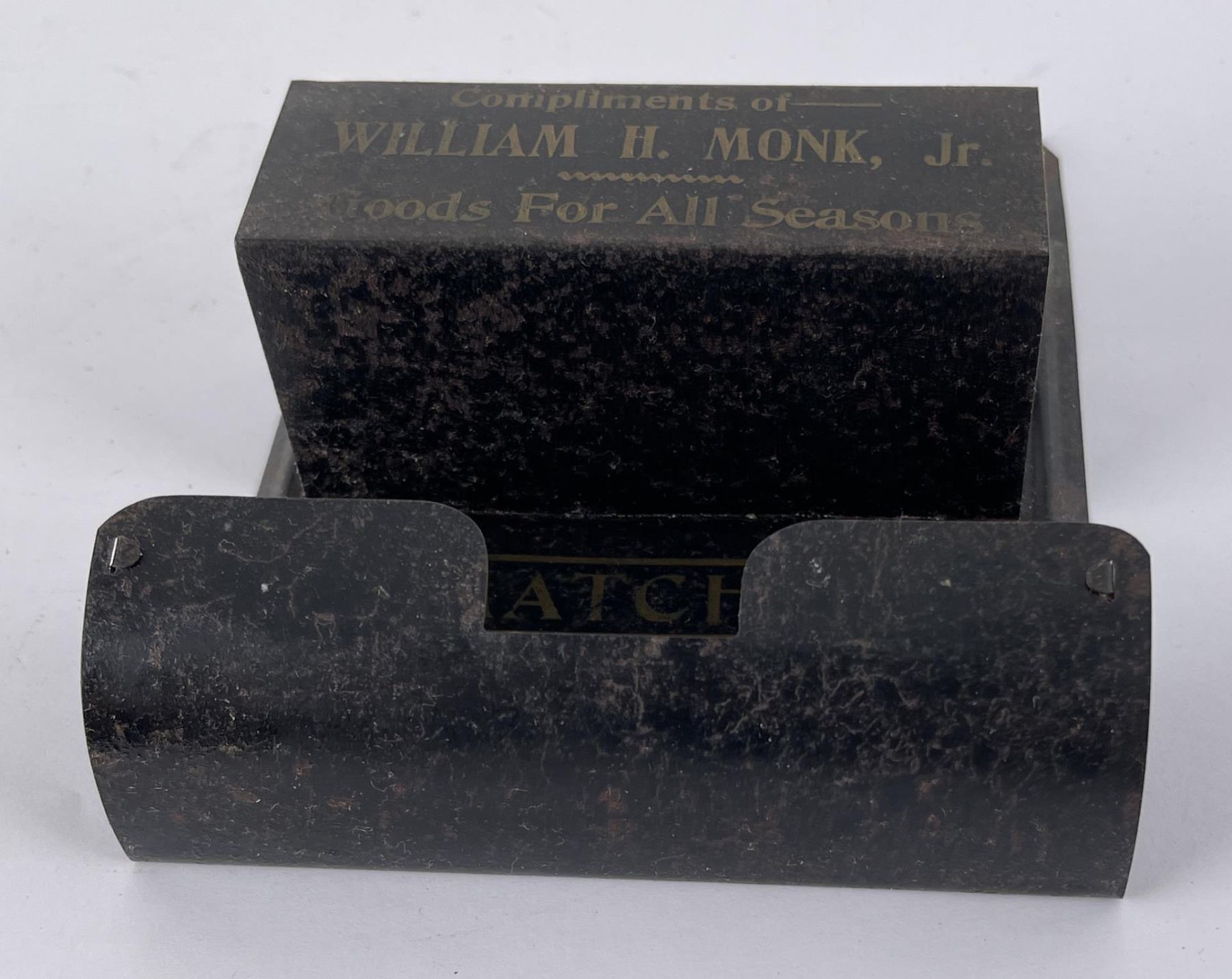 Compliments of William H Monk JR. Goods for All Seasons. Salt and Pepper and Matchbox holder. I briefly googled his name and I can find an individual of that name residing in Alabama. 6 1/2" tall.