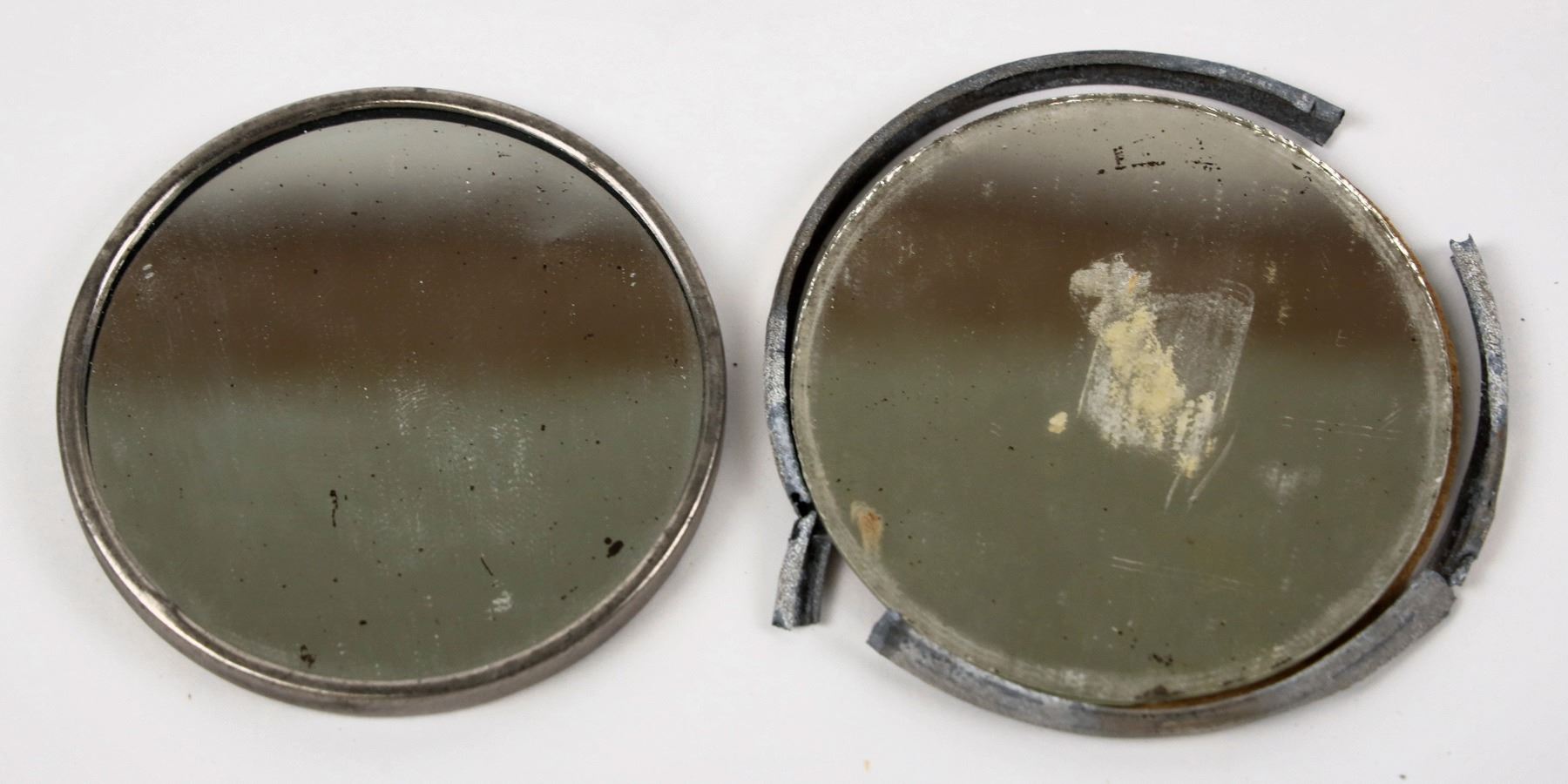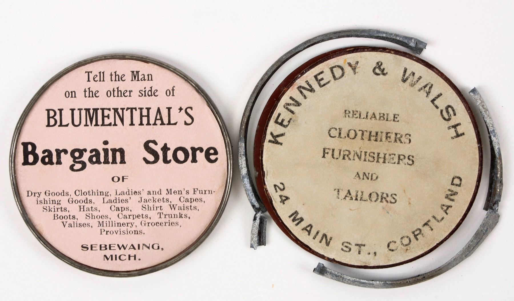 Two older advertising mirrors: 1) Blumenthal's Bargain Store/ Sebewaing, Michigan; 60 mm. 2) Kennedy & Walsh, 24 Main St., Cortland; 64mm, rim broken.