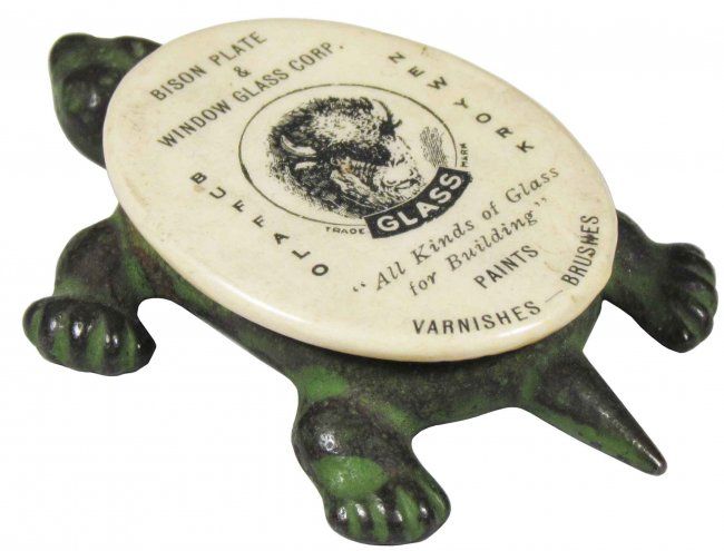 Advertising Paperweight for Bison Plate & Window Glass Corp. Buffalo, NY. Cast iron turtle with celluloid button top. Excellent condition. 2 1/2 inches long.