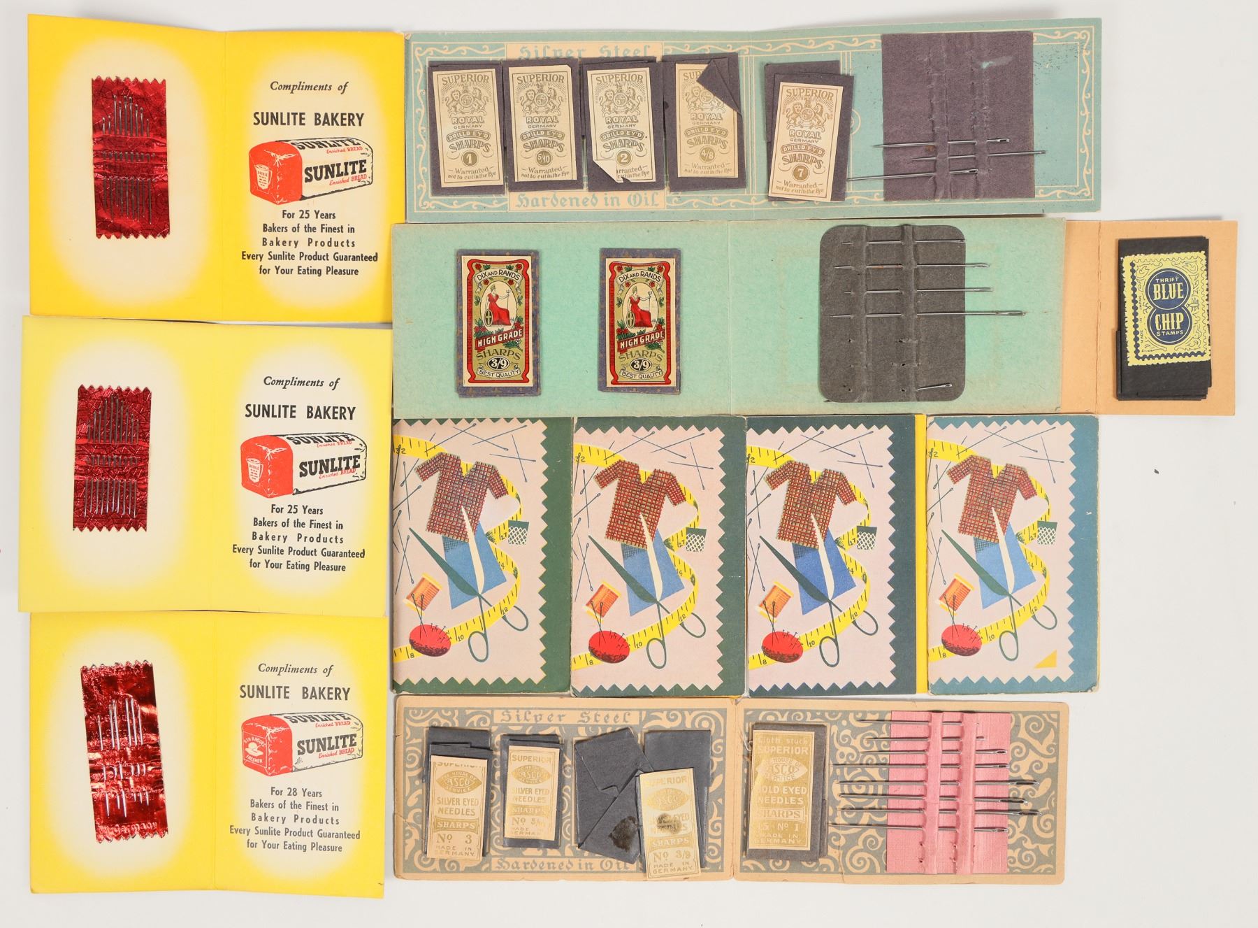 Unique collection of give-away needles used for advertising and patriotism. The Army & Navy Needle Book with the battleship Iowa illustrated is but one example. Colorful, unusual group. Please inspect.