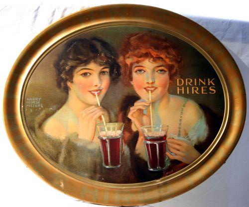 Tin advertising sign. Two attractive young women appear with Hire’s drink in their hands. Bright color with aged discoloration on rim. Harry Morse Meyers. 1915 . Over all high grade. Measures 22 ½" x 19 ½"