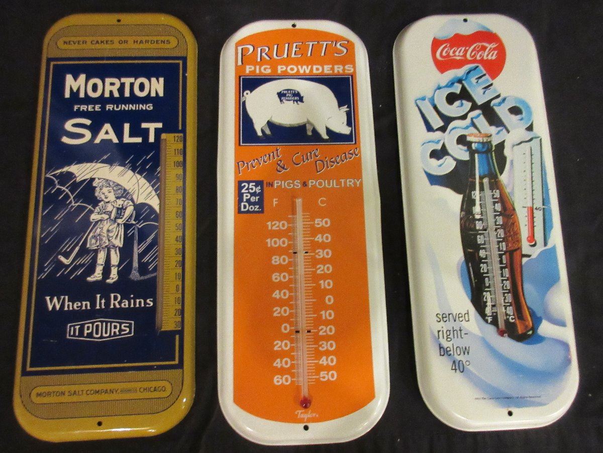 Lot of 3 indoor outdoor thermometers Approximately 16" by 5" Morton Free Running Salt Circa 1956, Coca Cola Ice cold below 40 degrees and Pruett's Pig Powder (no Markings of date etc. on thermometers)