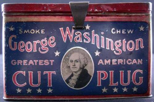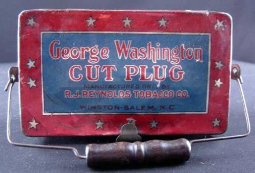 Advertising Tin, "George Washington Cut Plug," RJ Reynolds Tobacco Co., Winston-Salem, NC, converted into a purse inside, 4.5" x 7.5" x 4.5"