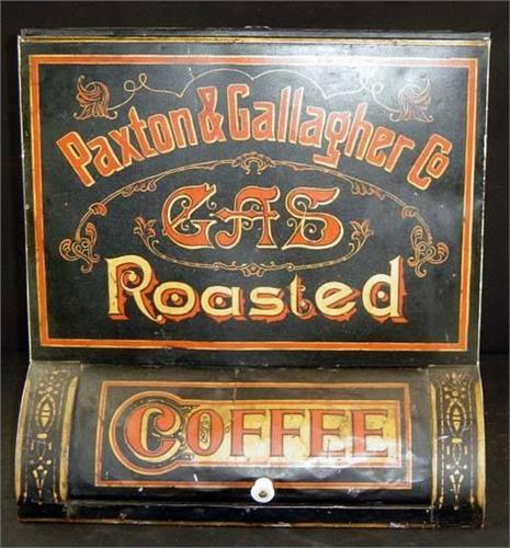 Advertising Tin, "Paxton & Gallagher Co., Gas Coffee Roasters" Store Bin, Made by Farrell & Co., Omaha, 19" x 18" x 17"