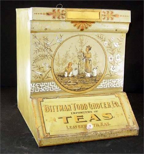 Advertising Tin, Store Bin, "Bittman Todd Grocer Co., Importers of Teas, Leavenworth, Kas.", 16" x 13.5" x 16"