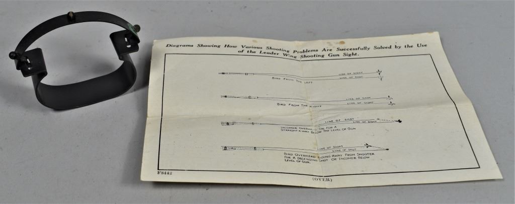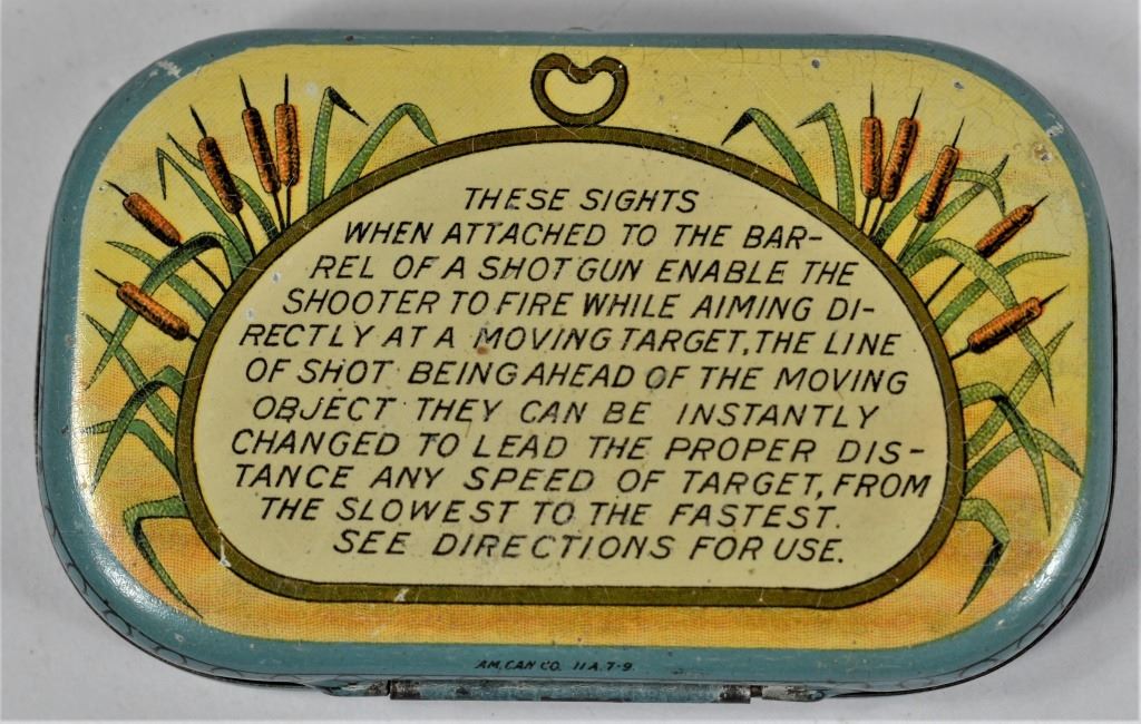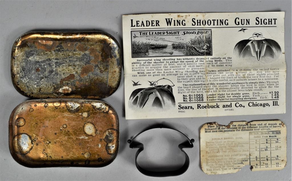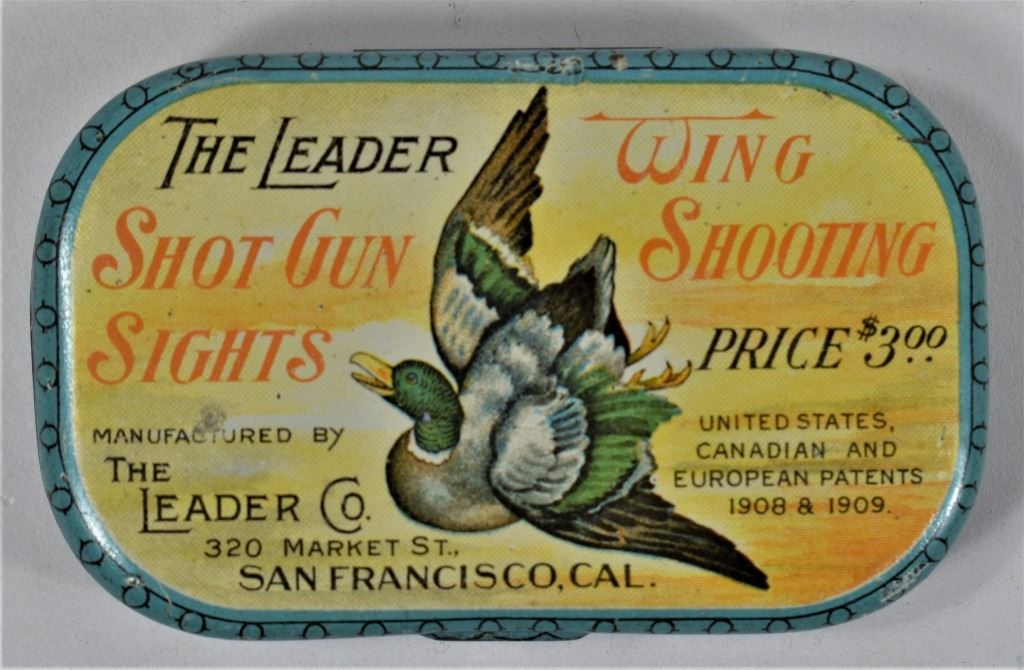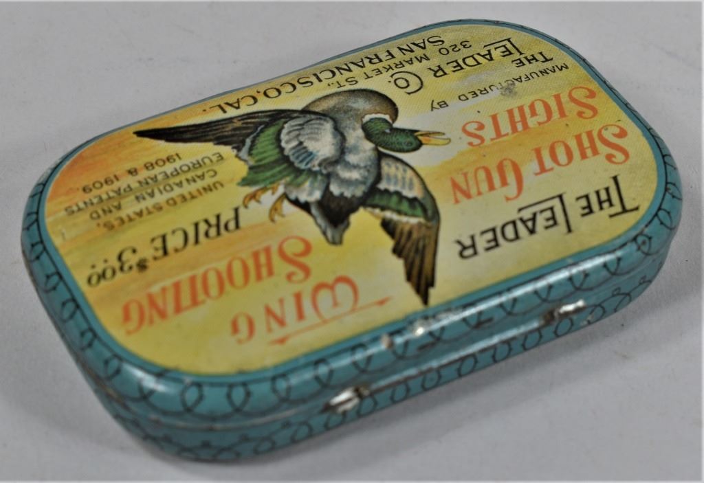 Advertising Tin for The Leader Shot Gun Sights. Outstanding color and graphics with Mallard on front cover, cattails and information on back. Comes with one sight and brochure. Minor edgewear otherwise excellent overall condition. 3 1/2 X 1/2 X 2 1/8 inches.