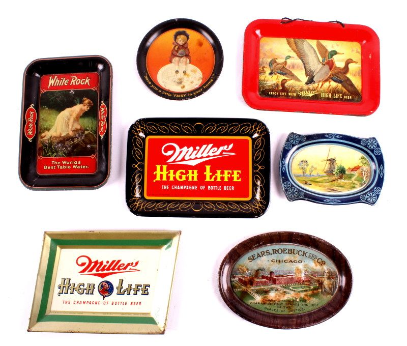 This is a collection of 7 tip trays. They are from Miller High Life, Sears Roebuck & Co., White Rock, Fairy Soap, and Mascot Tobacco. Each of the trays is all original and has retained its bright, vivid colors. They are in good condition. The largest tray is 4.75" x 6.5".