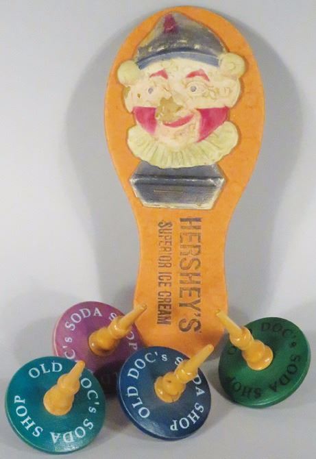 Advertising Toy Tops and Noise Maker. Molded cardboard Hershey's Superior Ice Cream noise maker. Four "Old Doc's" wood tops. Noise maker measures 6 1/2 inches.