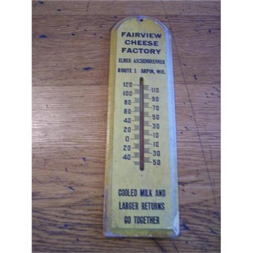 Old wooden advertising thermometer.Fairview Cheese Factory.I belive this is from Wisconsin.Has the glass piece.Measures 12 1/8" long.Some paint loss at top and bottom but not bad.