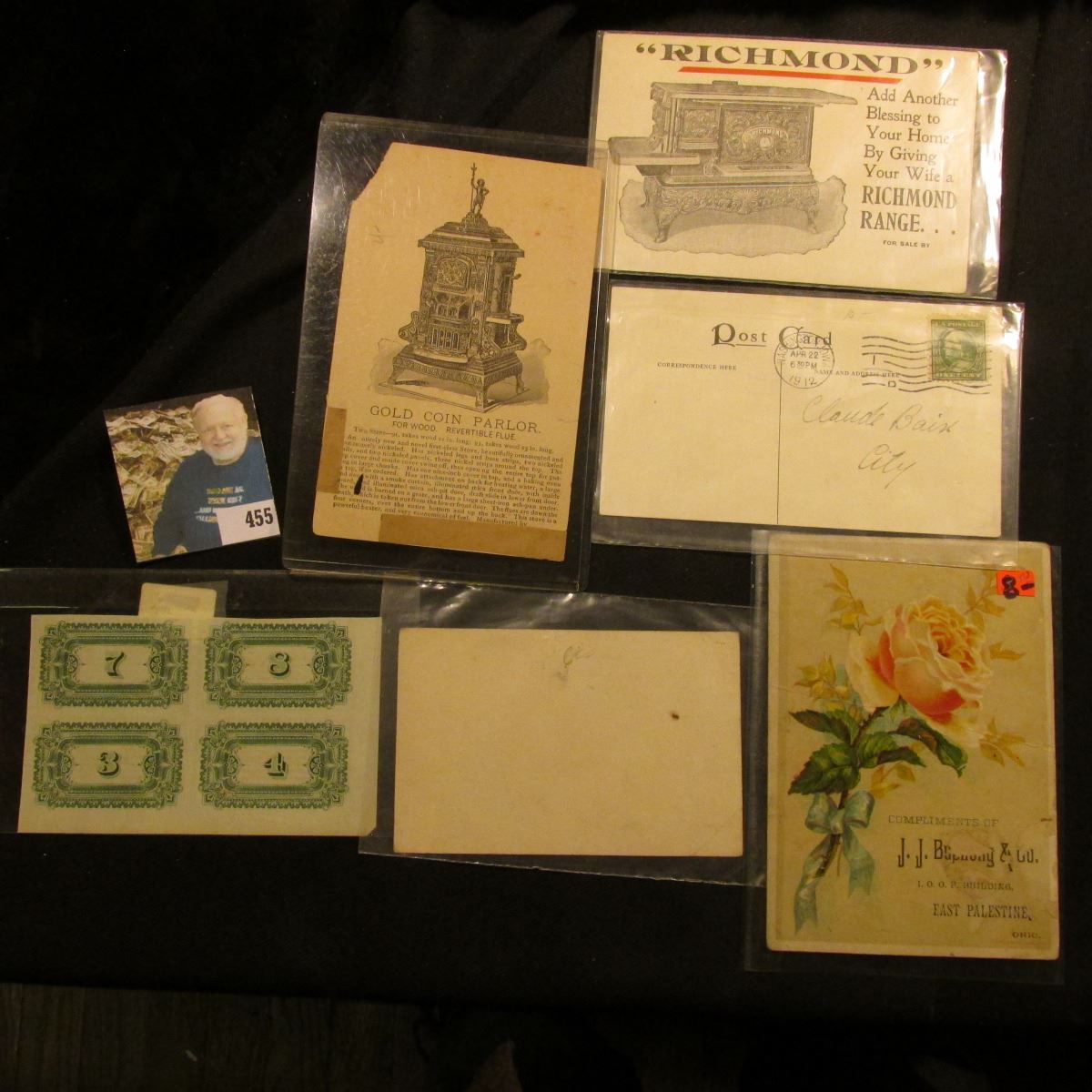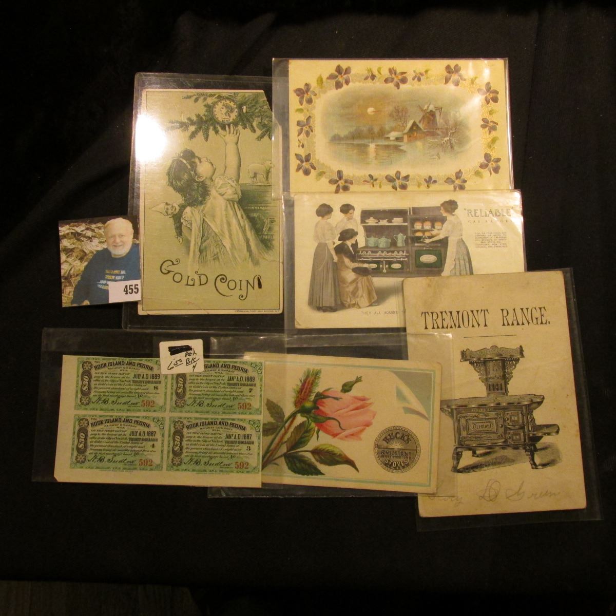 Advertising card with corner damage for "Gold Coin Parlor For Wood Revertible Flue"; advertising card ""Richmond" Add Another Blessing to Your Home By Giving Your Wife a Richmond Rangeā¦"; 1912 Postmarked and stamped Post card advertising ""Reliable" Gas Ranges"; "Tremont Range" advertising card East Palestine, Ohio; "Buck's Brilliant Stoves" advertising card; & (4) attached 1887-89 Coupons for "Rock Island and Pioria Railway Company".