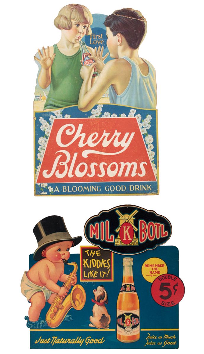 Advertising cdbd diecuts w/easel backs (2), Mil K Boil & Cherry Blossoms, cute children graphics, Exc & Good cond, up to 22"H x 14"W.