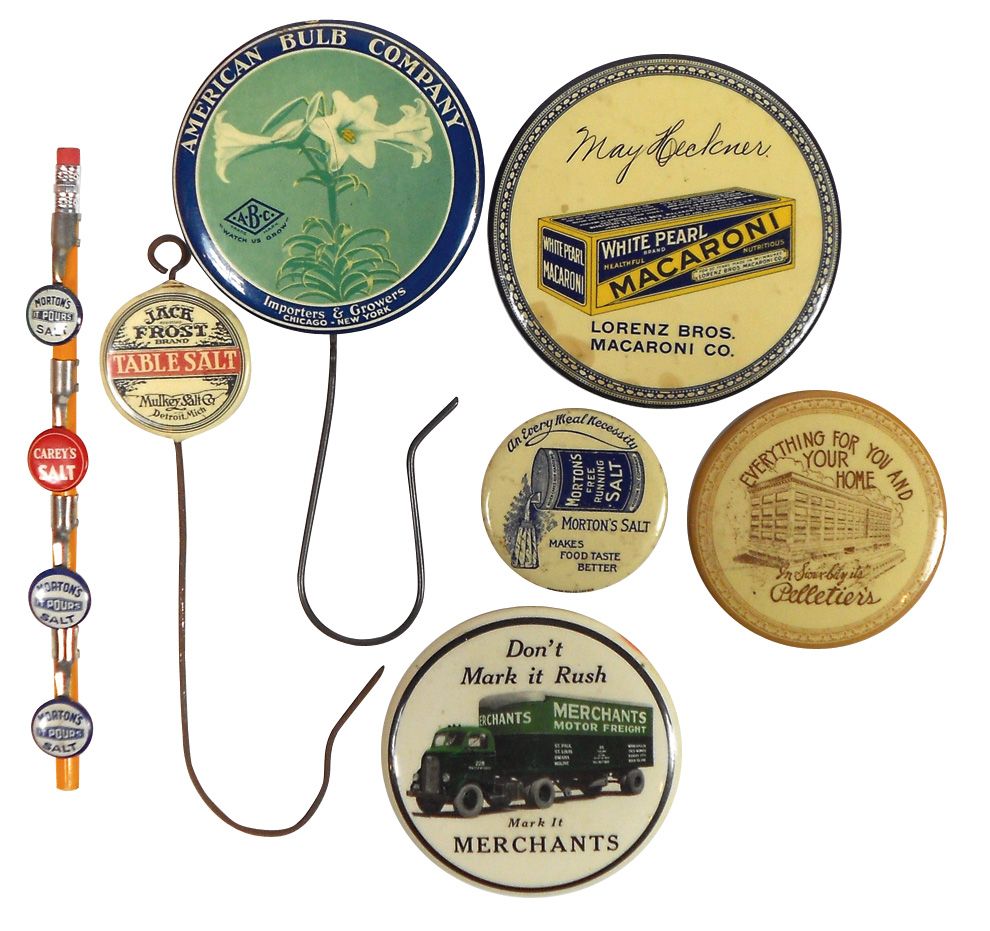 Advertising celluloid pocket mirrors, bill hooks, paperweight, etc. (10), White Pearl Macaroni, Pelletier's Dept Store-Sioux City & Morton's Salt mirrors, Merchants Motor Freight paperweight w/"1832 Miles of Daily Service" on back, American Bulb Co. & Jack Frost Table Salt bill hooks & Morton's & Carey's Salt pencil clips, a great assortment in VG & Exc cond, up to 4"Dia.