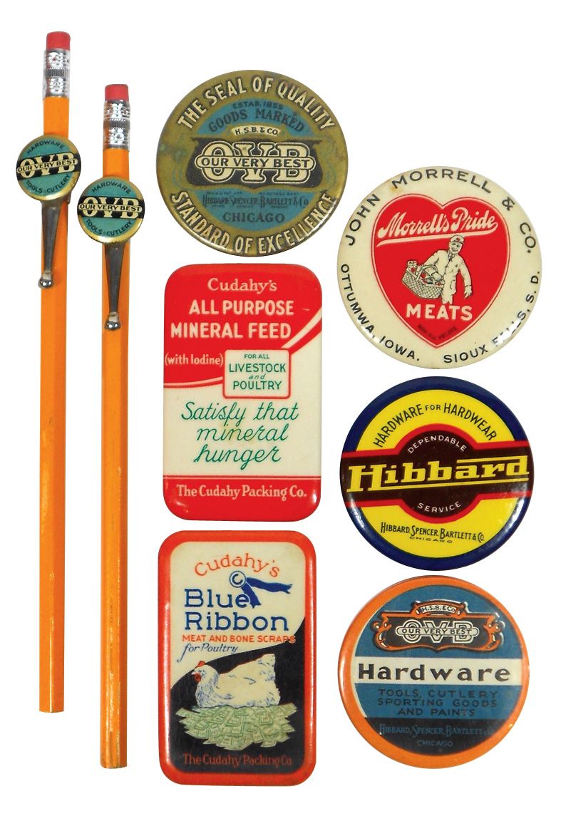 Advertising celluloid pocket mirrors, whetstones & pencil clips (8), (2) Our Very Best Hardware mirrors (cracked mirror on one), Hibbard, Spencer Barlett & Co. Hardware-Chicago & John Morrell & Co.-Ottumwa & Sioux Falls mirrors, Cudahy's Blue Ribbon Meat & Bone Scraps & Cudahy's Mineral Feed whetstones & (2) OVB Hardware pencil clips, all Exc cond unless noted, up to 3"H.