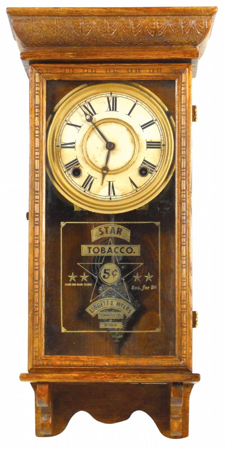 Advertising clock for Star Tobacco from Liggett & Myers Tobacco Co.-St. Louis, Rare 1/4 size oak regulator w/pendulum & key, early 1900's, Exc cond, 20"H x 8.5"W.