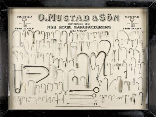 Advertising display for O. Mustad & Son fishhook manufacturers, Oslo, Norway, established 1832 Key brand. This advertising display board shows every manor fish hook from largest to smallest manufactured by this maker. The hooks are numbered to be used like a catalog for orders. The case measures 23” by approx. 30” (exterior dimensions). Features over 200 hooks, some very unusual and complicated, some blued, some brass andgold plated. The interior is in good to very good condition with some fading and slight aging. The case has been over painted many years ago and shows Aeroplane Tackle, Denver, Colorado beneath the black over paint. Wewould guess the date of this advertiser 1920’s to 30’s from the styles of hooks. Est: $750 - $1,500