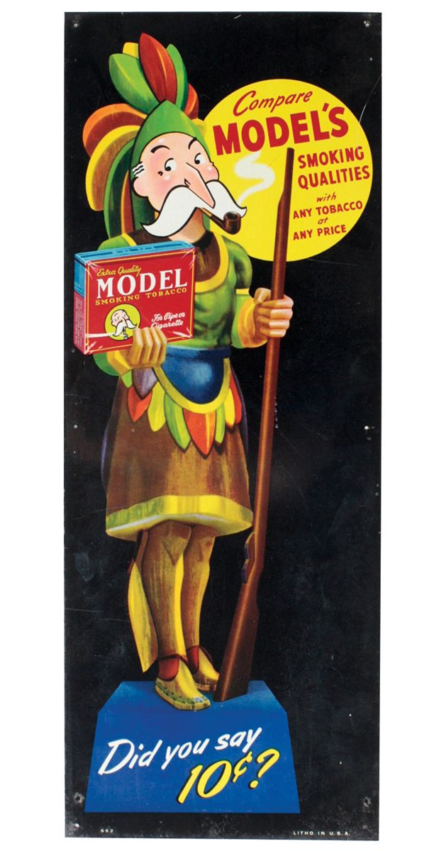 Advertising door push & sign (2), Reach for Bunny Bread, embossed metal, VG/Exc cond w/minor wear, 3"H x 28"W & Model's Smoking Tobacco metal sign w/colorful Cigar Store Indian, Exc cond, 15"H x 5.75"W.