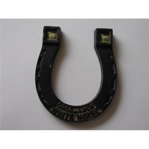 A black painted iron horseshoe made as an advertising piece for " WHITE HORSE" distillery.