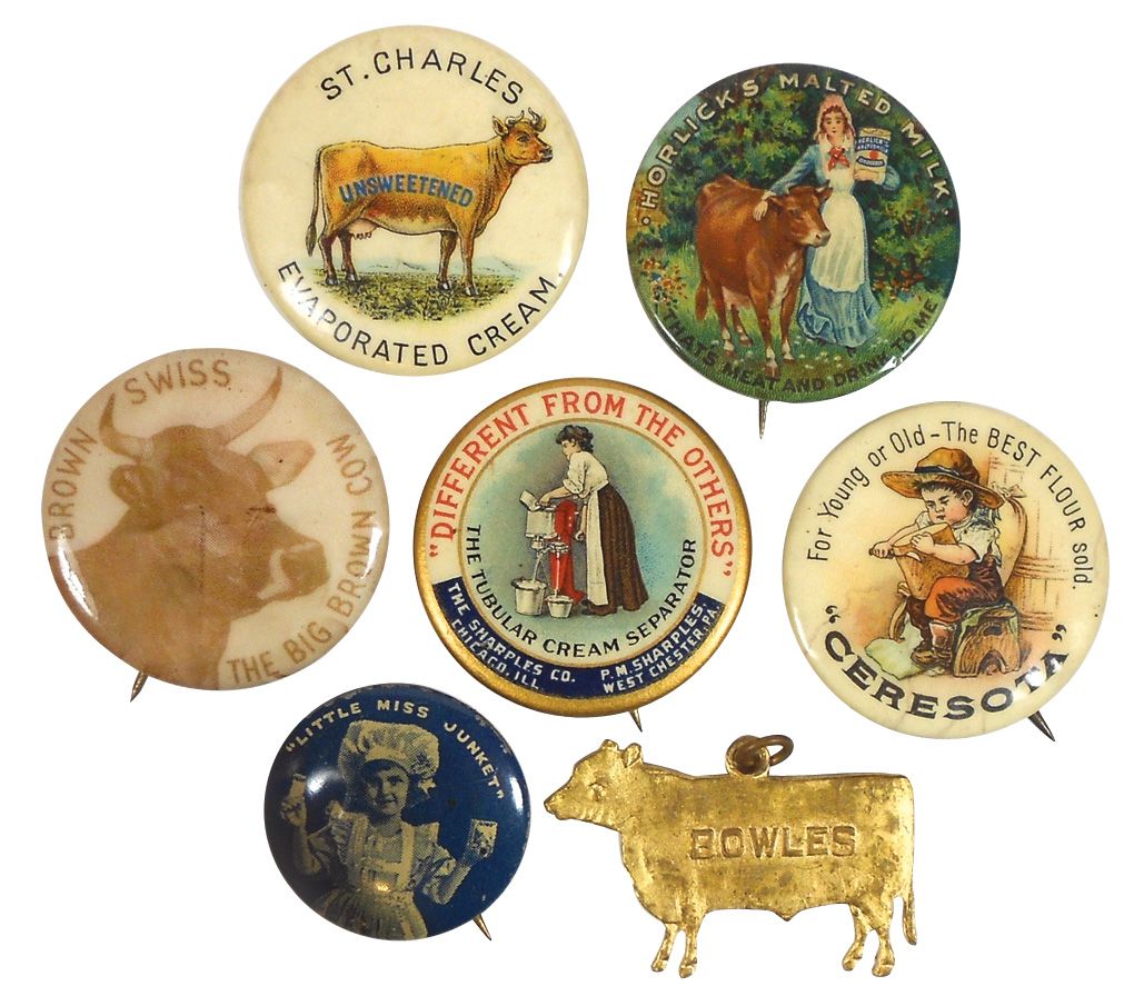 Advertising pinbacks & charm (7), Sharples Cream Separator, Ceresota Flour, Horlick's Malted Milk, St. Charles Evaporated Milk, Brown Swiss, Little Miss Junket & Bowles Live Stock Com.-Chicago & KC, all early 1900's in Exc cond, approx 1.25"Dias.