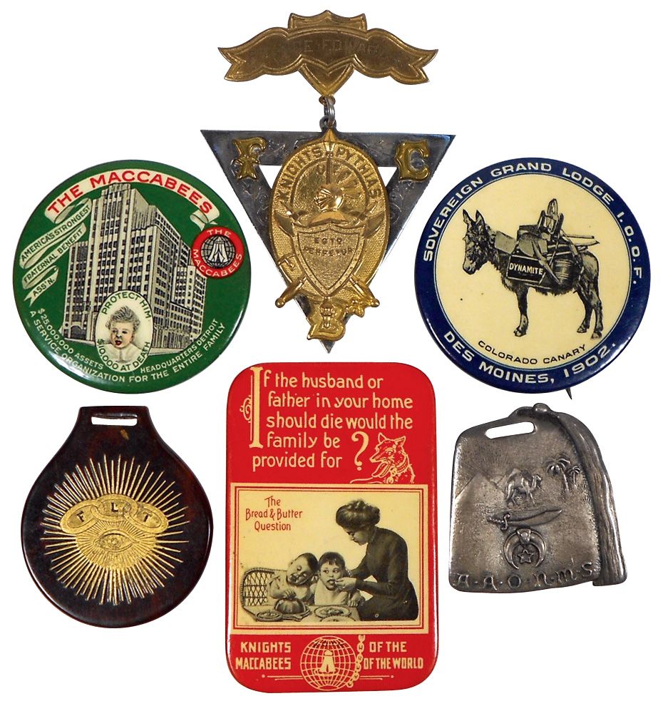 Advertising pocket mirrors, badges & watch fobs (6), Sterling Shriner fob/pin combination, Bakelite FLT fob, Sovereign Grand Lodge I.O.O.F.-Des Moines badge by Whitehead & Hoge, c.1896, Knights of Pythias badge inscribed Prince Edward-Lodge #42 & 2 Knights of the Maccabees mirrors, all Exc cond, up to 3.25"L.