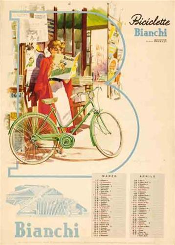 Title: BIANCHI - Author: E.GUSMAROLI - Offset - 1952 - 48x34 - Quality: B+ - Calendar of 6 coloured pictures (bicycle, motorcycle, bus)
