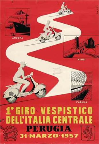 Title: 1° GIRO VESPISTICO DELL'ITALIA CENTRALE, PERUGIA - Author: SASSI - Litograph - 1957 - 95x66 - Quality: B -
