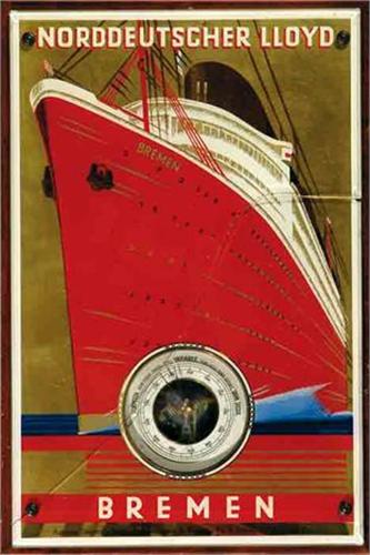 Title: BREMEN NORDDEUTSCHER LLOYD - Author: BERND STEINER - Barometer-Advertising on light glass on wood base - 1933 - 60x40 - Quality: C - (Glass with a clear crack)