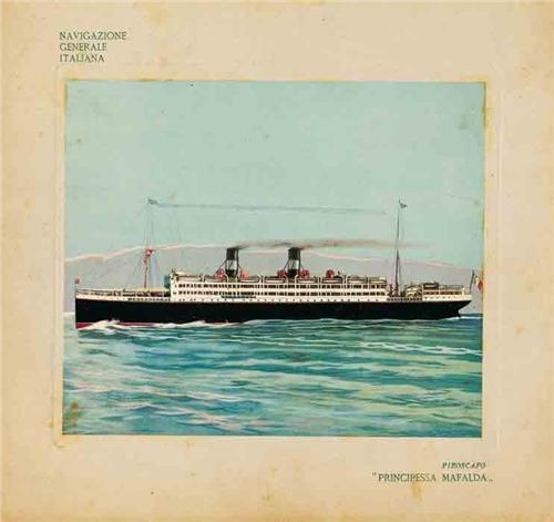 Title: NAVIGAZIONE GENERALE ITALIANA, PIROSCAFO "PRINCIPESSA MAFALDA" - Author: ANONYMOUS - Litograph - 1910 ca - 32x34 - Quality: A - Lot of 6 cardboards that represent the ship