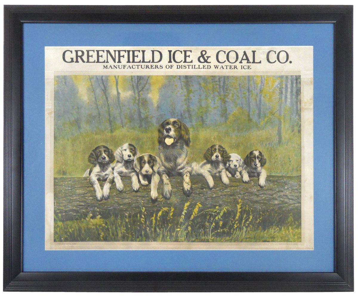 Advertising print from Greenfield Ice & Coal Co., titled "The Gang's All Here", from a painting by R. Ingerle, early 1900's, Exc cond, prof matted & framed, 29"H x 36"W.