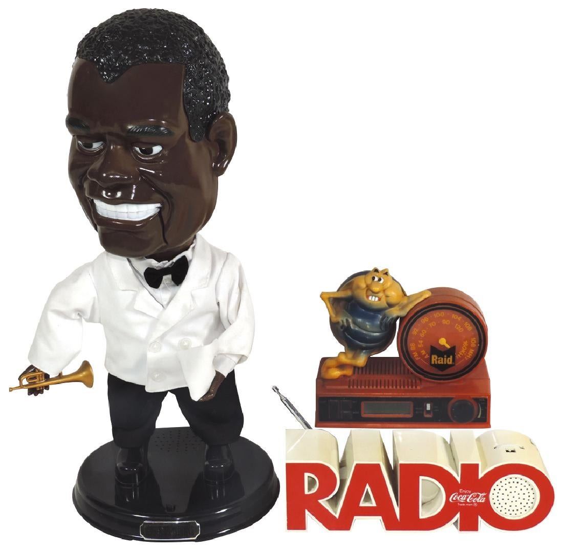 Coca-Cola & Raid battery-operated radios & Louis Armstrong animated singing figure, all VG untested cond, up to 19"H.