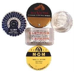 Advertising record brushes & paperweights (5); RCA, M-G-M & Blue Ribbon Needles, M-G-M from Kress Records-Wichita, KS, all mfgd. by Phila. Badge Co, VG-Exc. condition, 3.5"Dias. & Fulton Clothing-Wichita & Fontius Shoes glass paperweights.