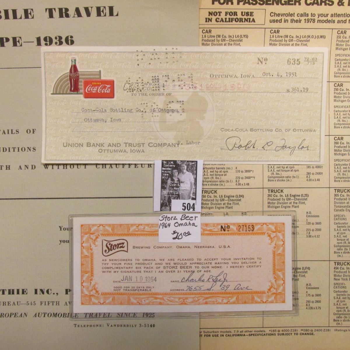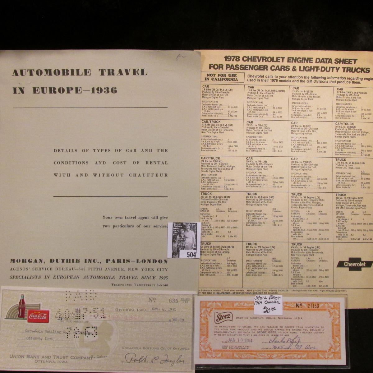 Advertising sheet "1978 Chevrolet Engine Data Sheet for Passenger Cars & Light-Duty Trucks"; flyer on heavy paper for "Automobile Travel in Europe-1936"; 1964 Storz Brewing Company, Omaha, Nebraska, U.S.A. Scrip; & a 1951 Check signed by Robert Taylor on a Coca-Cola Bottling Co, of Ottumwa, Iowa.