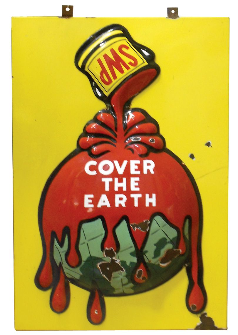 Advertising sign, Sherwin-Williams Paint "Cover the Earth", 5-color embossed porcelain, Good+ to VG cond w/some porcelain loss, 37"H x 24"W.