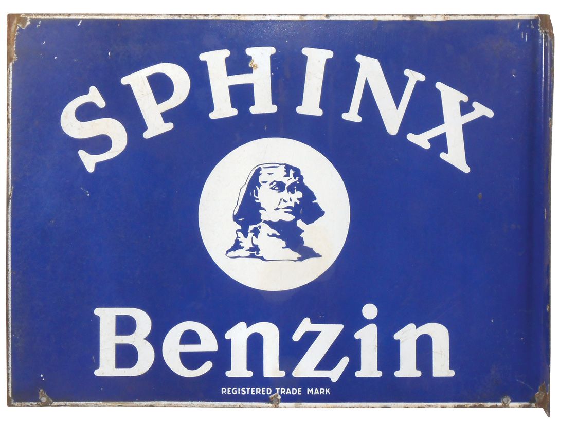 Advertising sign, Sphinx Benzin, 2-sided porcelain flange in VG cond w/edge wear, 19"H x 26"W.