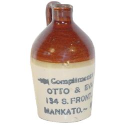 Advertising stoneware mini jug, Compliments of Otto & Evans-134 S. Front St.-Mankato, Minn., small p