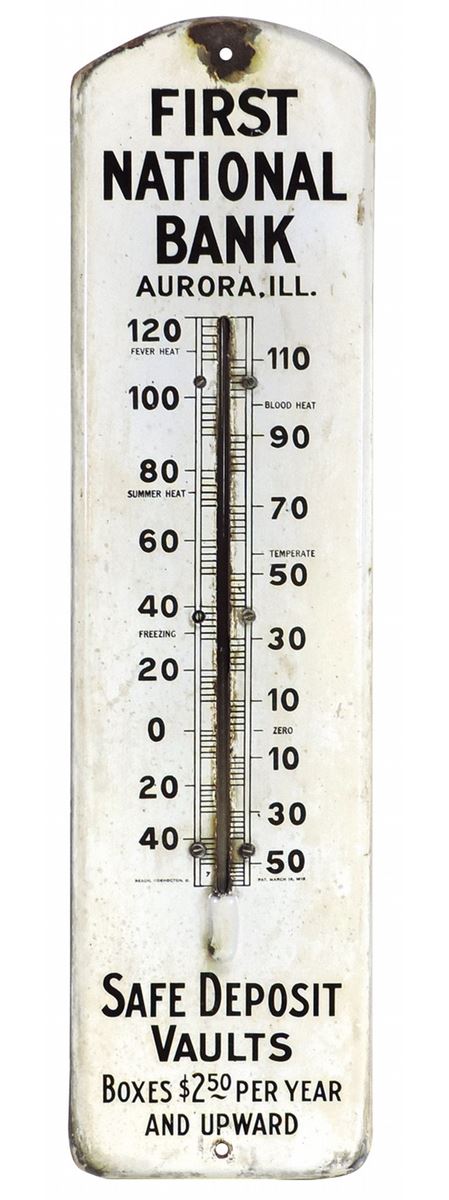 Advertising thermometer, First National Bank-Aurora, Ill, porcelain, made by Beach-Coshocton, O., pat March 16, 1918, VG cond, 27"H x 7"W.