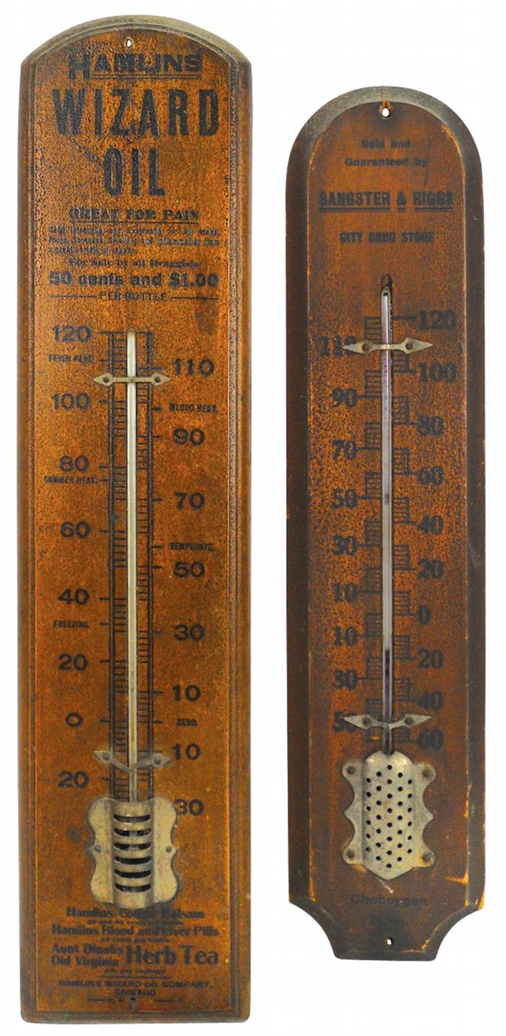 Advertising thermometers (2) for Hamlin's Wizard Oil & Sangster & Riggs City Drug Store-Cheboygan, both in G/VG cond, 18" & 21.5"H.