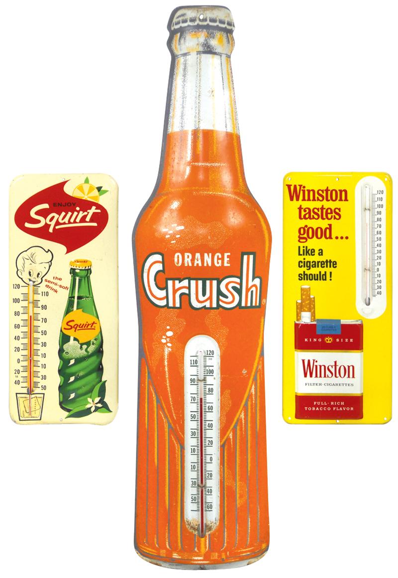 Advertising thermometers (3), Orange-Crush die cut bottle shape (light rust), Squirt & Winston Filte